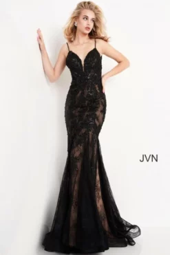 Style JVN06475 from JVN by Jovani is a form fitting embellished lace prom dress with a nude underlay featuring a beaded spaghetti strap bodice with plunging neckline.