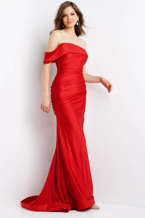 Style JVN07640 from JVN by Jovani is a Form Fitting, Asymmetric Off Shoulder Evening Gown with Ruched Bodice and Sweep Train.