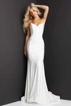Style JVN07643 from JVN by Jovani is a Slim Fitting, Sweetheart Neckline Prom Gown with Spaghetti Straps, lace up back, and Sweep Train.