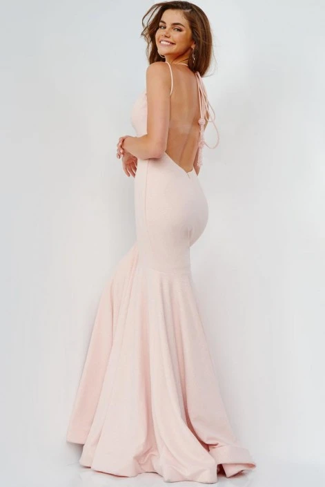 Style JVN08469 from JVN by Jovani is a prom gown with a deep V-neckline, fit-n-flare silhouette, thin straps with a tassel at the back of the neck, and a deep open back.