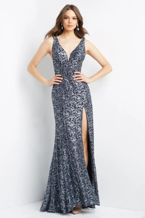 Style JVN08512 from JVN by Jovani is a Sleeveless, Sparkling Lace Prom Gown with Deep V Neckline, sheer side cutouts, open V back, and High Slit.