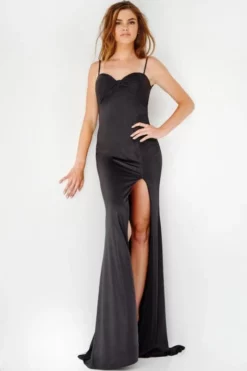 Style JVN08603 from JVN by Jovani is a prom gown with a sweetheart neckline, open back with tassel detailing on the straps, thigh high front slit, and a train.