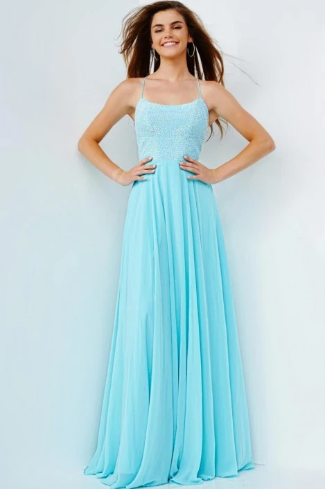 Style JVN22288 from JVN by Jovani is a prom gown with a scoop neckline on the beaded bodice, A-line silhouette, fitted bodice, and thin straps that criss-cross and tie in an open back.
