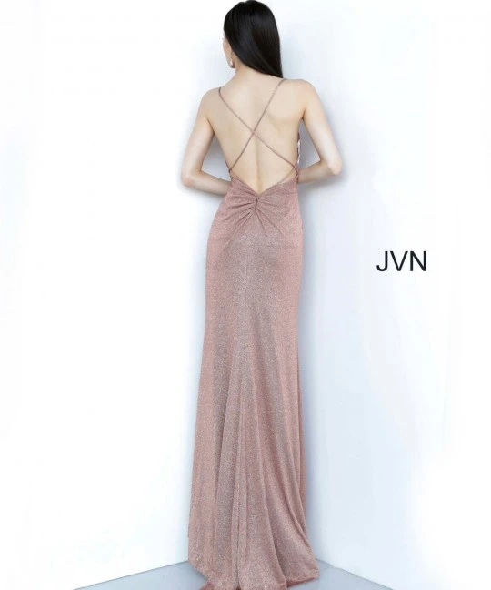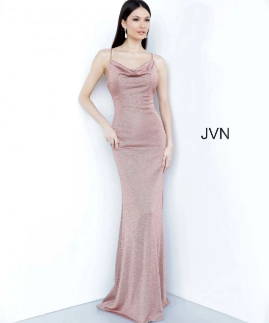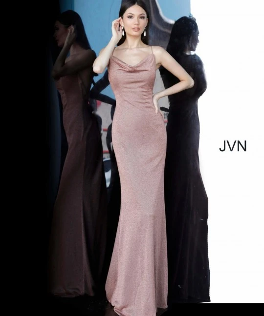 Style JVN2375 from JVN by Jovani is a Cowl Neckline Backless Prom Gown.