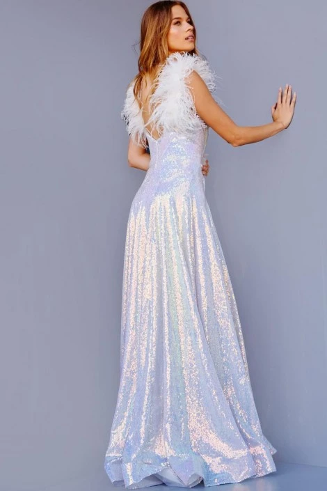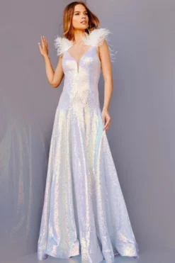 Style JVN24164 from JVN by Jovani is a shimmering prom gown with a plunging neckline with mesh insert, feathered shoulders, and an open back.