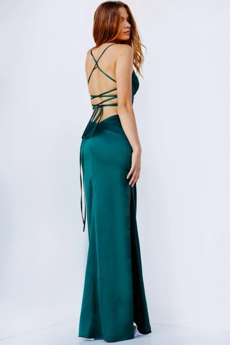 Style JVN24334 from JVN by Jovani is a prom gown with a sweetheart neckline, pleated bodice, thin straps that tie-up in an open back, and a thigh high front slit.