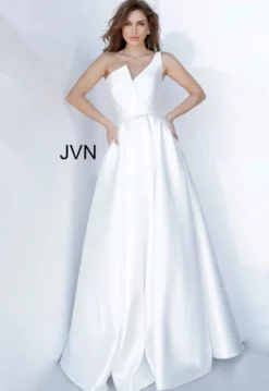 Style JVN3930 from JVN by Jovani is a simple yet elegant prom dress that features a sleeveless, one-shoulder asymmetric neckline with a fitted bodice.