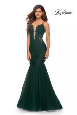 Style 29680 from La Femme is a lace mermaid prom gown with applique, deep V-neckline with mesh insert, sheer illusion sides and back, and a train.