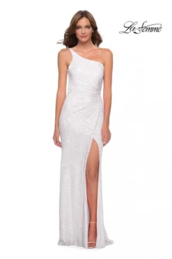 Style 29962 from La Femme is a one shoulder sequin prom gown with asymmetrical ruching, a high skirt slit, and an open back.
