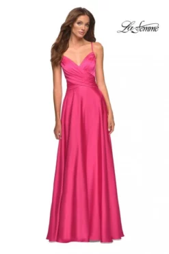 Style 30616 from La Femme is a lovely satin A-line gown with criss-cross ruched bodice, V-neckline, high slit in skirt, pockets, and a lace-up back.