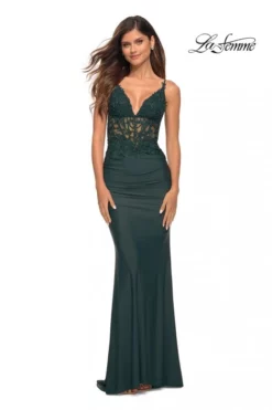 Style 30757 from La Femme is a lace and jersey prom gown with a deep V-neckline, lace illusion bodice, low V-back, and a train.