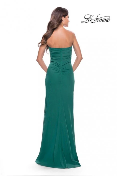 Style 31058 from La Femme is a strapless net jersey prom gown with a sweetheart neckline, fitted silhouette, ruching, open back, thigh high front slit, and a train.