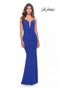 Style 31114 from La Femme is a net jersey evening gown with a deep V-neckline featuring three jeweled straps, all-over ruching, fitted silhouette, lace-up strappy back, and a train.
