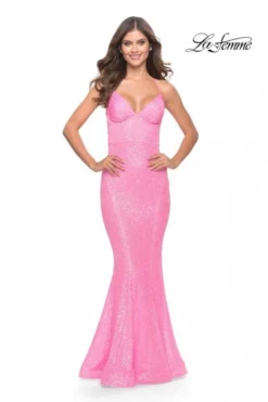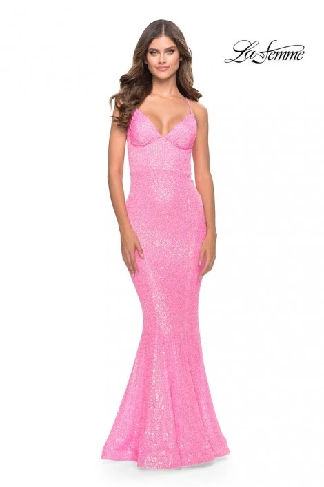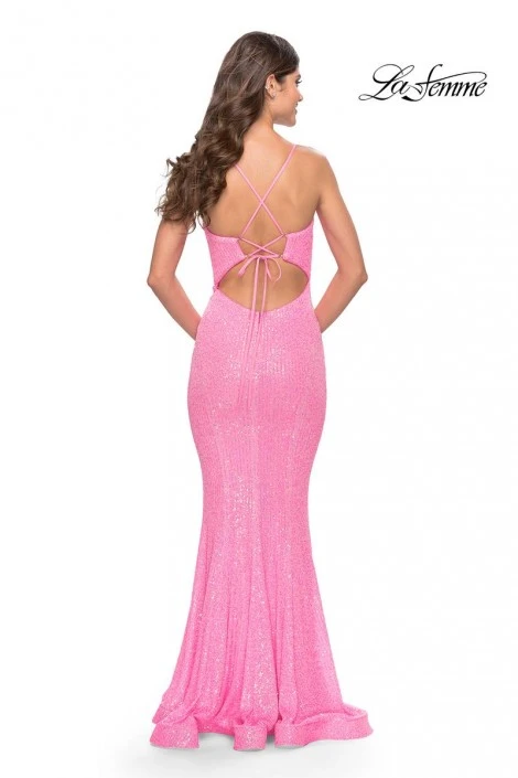 Style 31199 from La Femme is a sequin prom gown with a V-neckline, fit-n-flare silhouette, and an open back with thin lace-up tie straps.