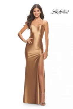 Style 31208 from La Femme is a liquid jersey prom gown with a square neckline, thin straps that criss-cross and tie in a deep open back, high slit, and a train.