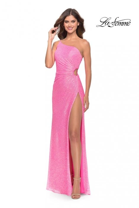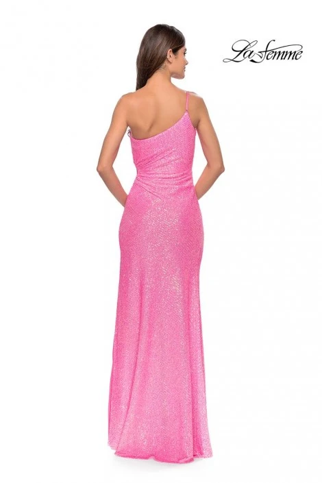 Style 31213 from La Femme is a one-shoulder sequin prom gown with an asymmetrical neckline, ruched bodice with side keyhole opening, open back, and a high front slit.