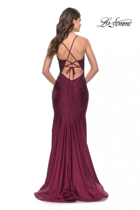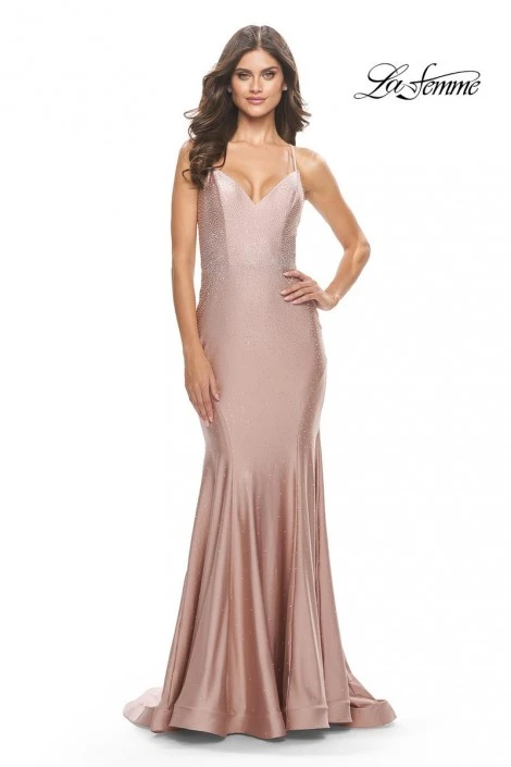 Style 31220 from La Femme is a hot stone jersey prom gown with a V-neckline, fit-n-flare silhouette, thin straps that criss-cross and tie in a deep open back, and a train.