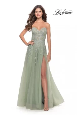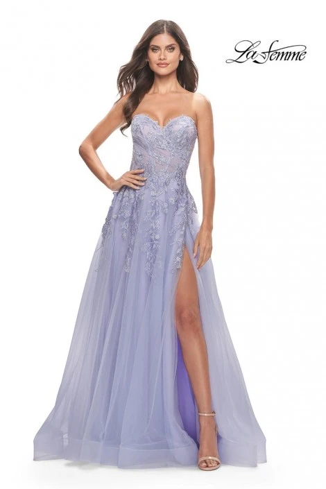 Style 31363 from La Femme is a strapless lace and tulle prom gown with a sweetheart neckline, A-line silhouette, lace-up corset back, and a thigh high front slit.