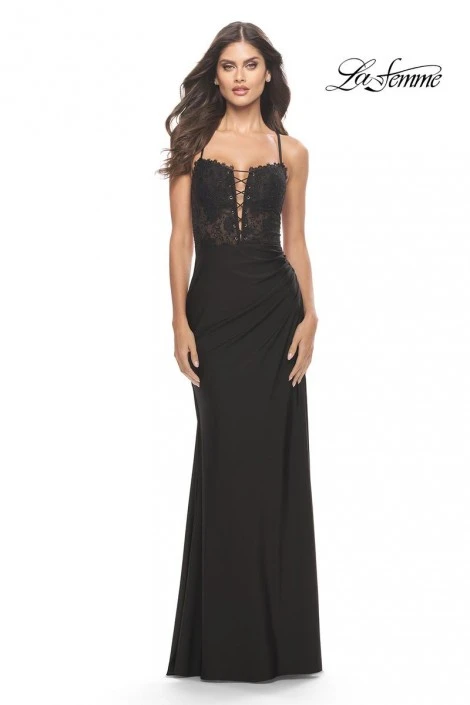 Style 31567 from La Femme is a prom gown with a deep V-neckline with lace-up tie, lace bodice, fitted silhouette, open back with thin tie-up straps, and a jersey skirt with a high front slit.