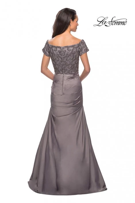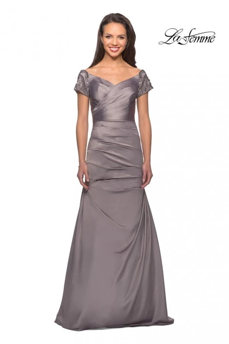 Style 25996 from La Femme is a short sleeve satin evening dress with beaded sleeves and back and a ruched bodice.
