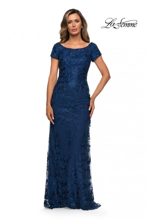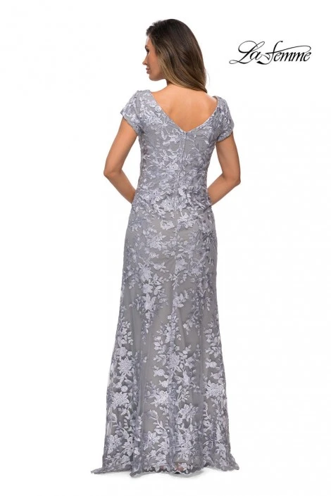 Style 27842 from La Femme is a short sleeve floral lace evening dress with a wide crew neckline and V back.