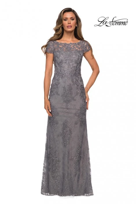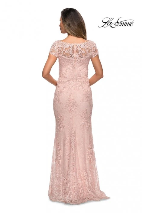 Style 27856 from La Femme is a short sleeve lace evening dress with sheer sleeves and neckline.
