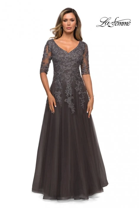 Style 27993 from La Femme is an elbow sleeve A-line tulle evening dress with a sheer floral embellished bodice and sleeves.