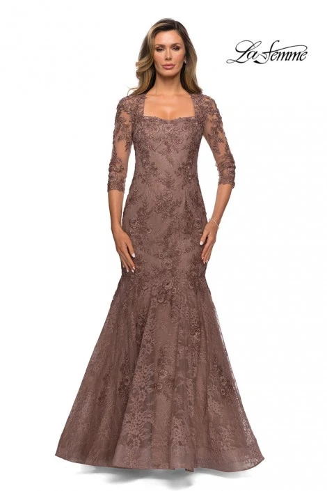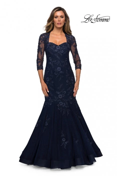 Style 28033 from La Femme is a three quarter sleeve lace mermaid evening dress with sheer sleeves and back.
