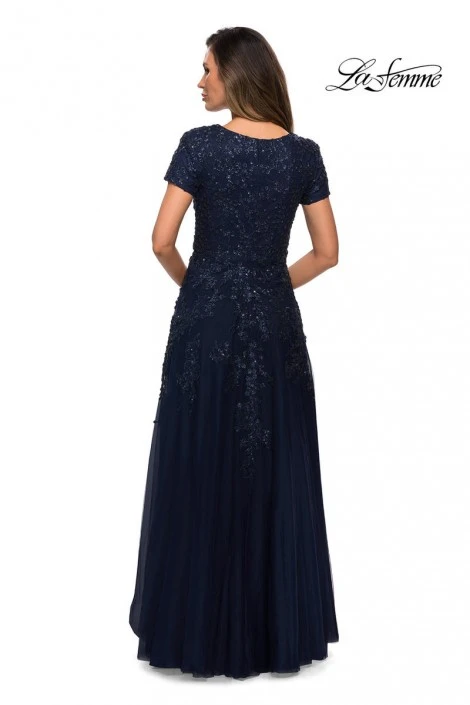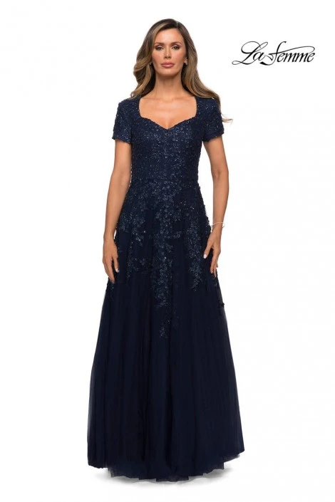 Style 28037 from La Femme is a short sleeve lace evening dress with a sweetheart neckline.