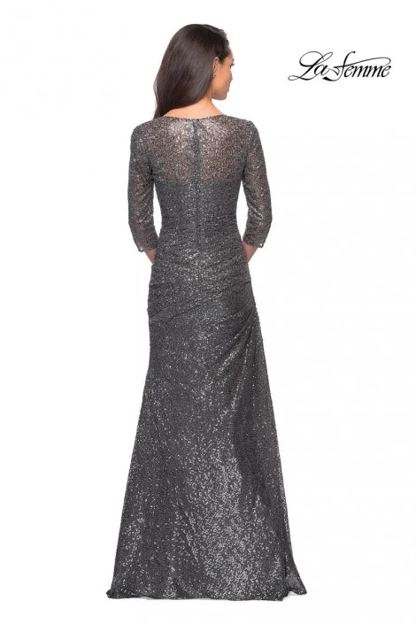Style 28065 from La Femme is a three quarter sleeve sequin evening dress with a sweetheart neckline.