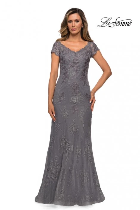 Style 28099 from La Femme is a short sleeve lace evening dress with a wide V neckline.