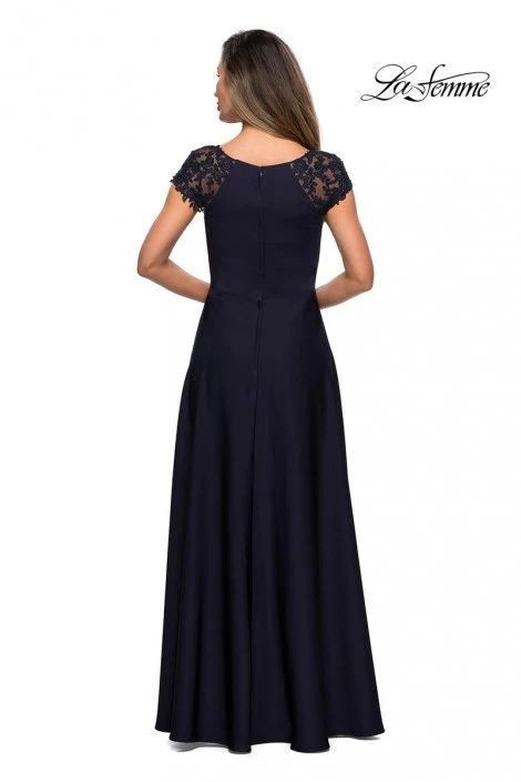 Style 28100 from La Femme is a short sleeve satin evening dress with an A-line skirt, a ruched neckline, and sheer lace sleeves.
