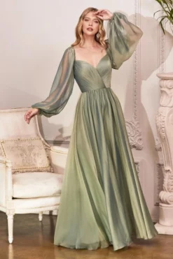 Style CD243 from Cinderella Divine is a bishop sleeve bridesmaid gown or evening dress with pleated V-neck bodice fitted to the waist and an A-line skirt. This gown can also be worn off shoulder. For this style use Size chart #1.