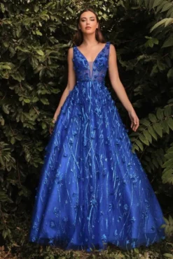 Style CB085 from Ladivine is a prom ballgown that has a plunging neckline with mesh insert, wide straps, 3D floral appliques, low V-back, and a train. Please use size chart #6.