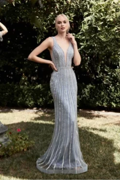 Style CD960 from Ladivine is a vertically beaded evening gown with a plunging neckline with mesh insert, fitted silhouette, belted waist, deep V-back, and a horsehair trim. Please use size chart #1.