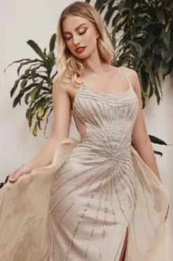 Style CD993 from Ladivine is an evening gown with a scoop neckline, fitted silhouette, beaded spaghetti straps, adorned illusion back, thigh high front slit, and a sheer overskirt. Please use size chart #0.