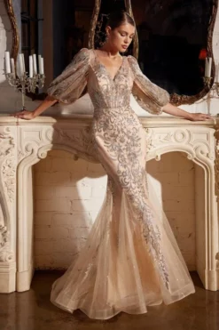 Style OC009 from Ladivine is a prom gown with a V-neckline, mermaid silhouette, three quarter puff sleeves, sheer corset bodice, and a deep V-back. Please use size chart #1.