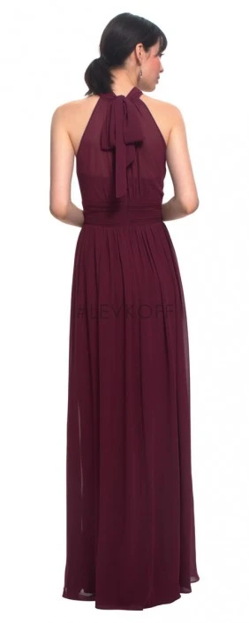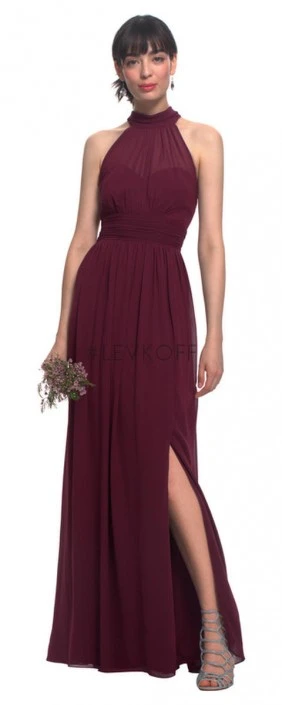 Style 7019 from #Levkoff by Bill Levkoff is a high neck halter top long bridesmaid gown with a self tie at the neck and a keyhole back. Illusion top over a sweetheart neckline, and a ruched cummerbund at the natural waist. Soft gathers surround the A-line skirt which has a knee high slit.