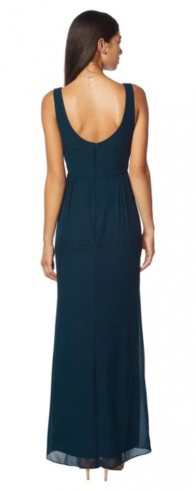 Style 7132 from #Levkoff by Bill Levkoff is a chiffon sleeveless V-front bridesmaid gown with a U back. Soft vertical gathers accent the mock surplice bodice, and the straight skirt has soft front gathers and an off-center slit.