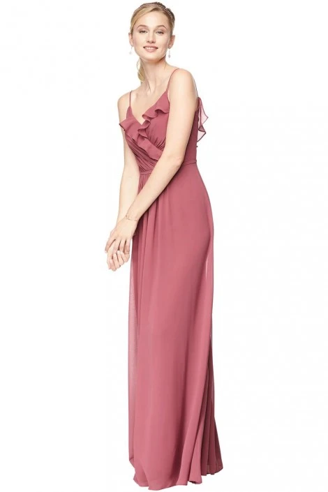 Style 7154 from #Levkoff by Bill Levkoff is a V-neck spaghetti strap bridesmaid gown with narrow criss-cross on the open back. Soft ruffle trim embellishes the neckline, bodice and V-back. Self mini band accents the waist, while soft front gathers accent the A-line skirt.