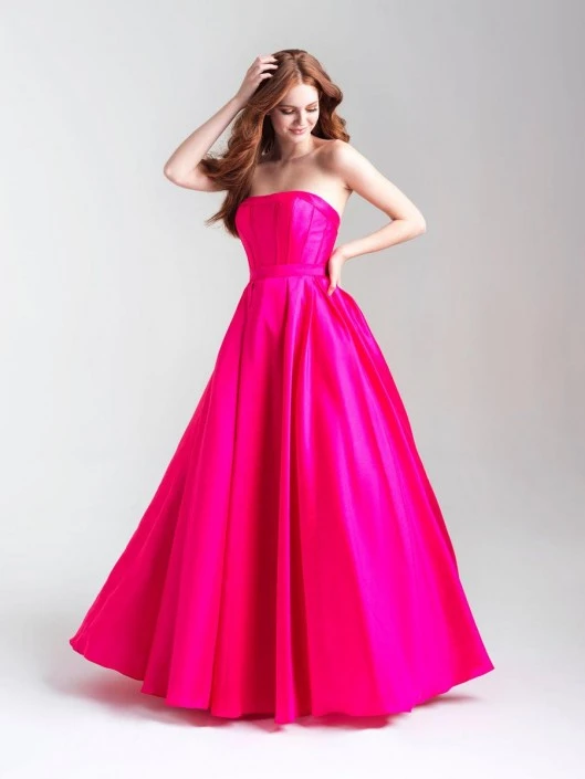 Style 20-323 from Madison James will help you steal the show in this elegant strapless satin ballgown with pockets.