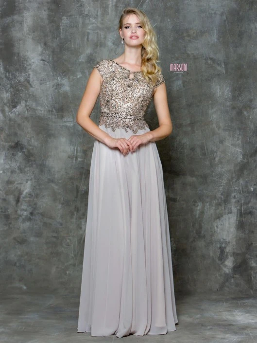 Style M173 from Marsoni by Colors is a cap sleeve keyhole chiffon mother of the bride gown with a beaded bodice and scoop back.