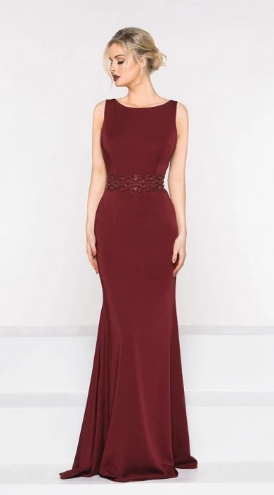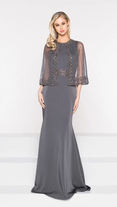 Style M232 from Marsoni by Colors is a sleeveless faille mother of the bride gown with a wide embellished waistline and a matching sheer embellished cape.