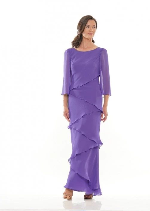 Style M302 from Marsoni by Colors is an asymmetrically tiered chiffon mother of the groom gown with sheer three quarter length sleeves.