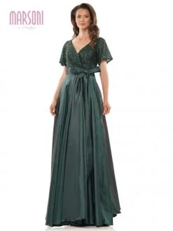 Style M316 from Marsoni by Colors is a short sleeve mother-of-the-bride gown with a V-neckline, sequin bodice, fully covered back, wide waistband with bow tie detailing, and a taffeta gathered A-line skirt.