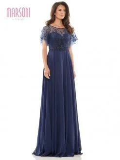 Style M323 from Marsoni by Colors is a chiffon mother-of-the-bride gown that has an illusion bateau neckline with sweetheart lining, sheer short flutter sleeves, keyhole detailed back, flowing A-line skirt, and a sweep train.