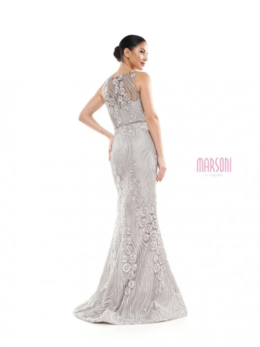 Style MV1047 from Marsoni by Colors is a sleeveless lace mother of the bride gown featuring an illusion neckline and back and a jeweled belt.