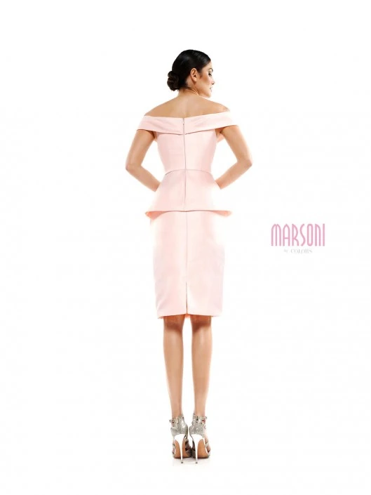 Style MV1059 from Marsoni by Colors is a satin fitted off the shoulder cocktail dress featuring a peplum and beaded details.