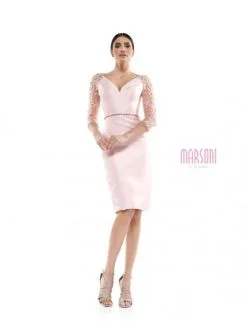 Style MV1061 from Marsoni by Colors is a satin cocktail length fitted guest of the wedding dress featuring a V neckline and sheer embellished three quarter length sleeves and back.