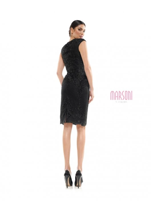 Style MV1063 from Marsoni by Colors is a lace fitted cocktail dress featuring a V neckline and cap sleeves.